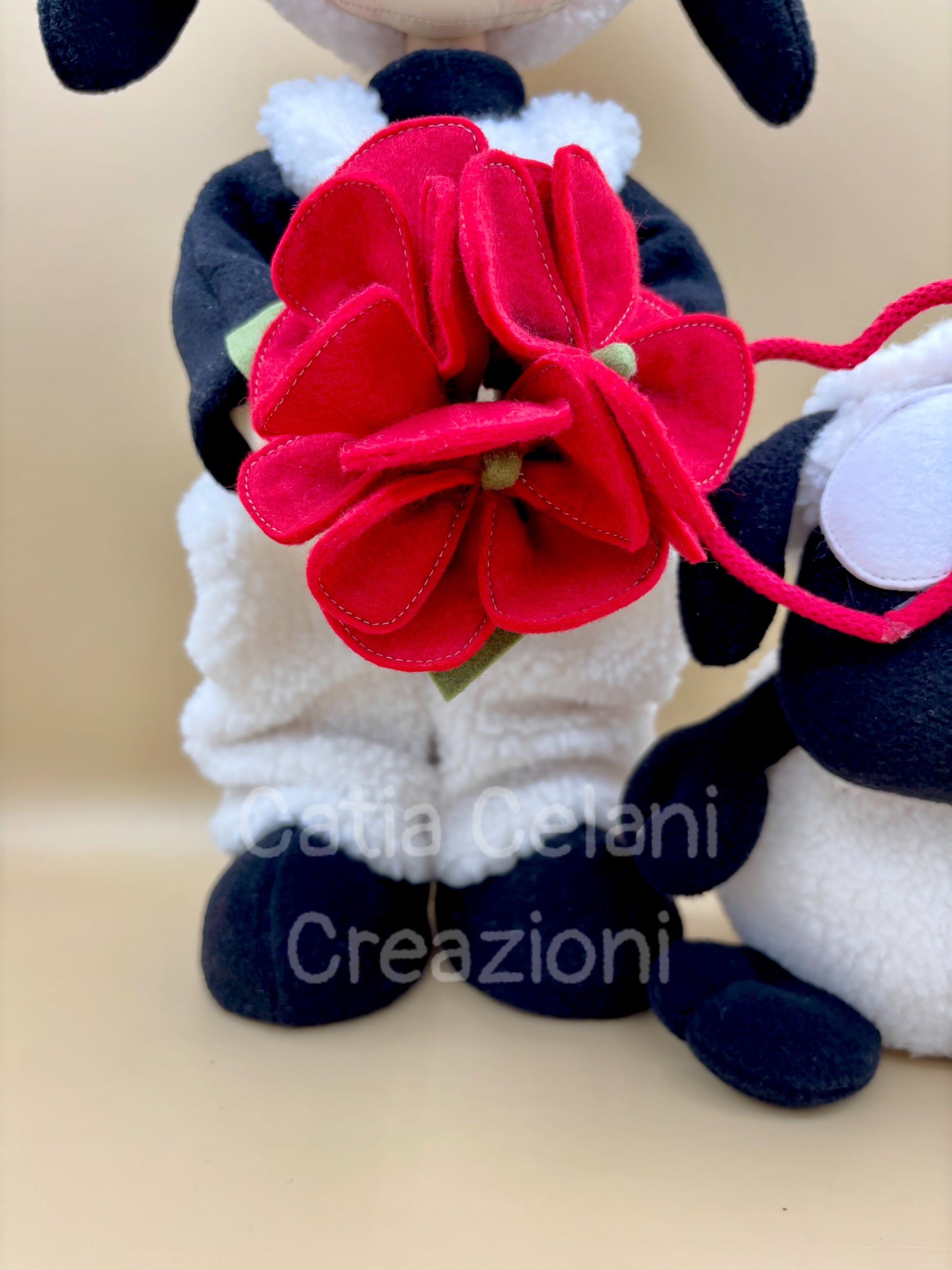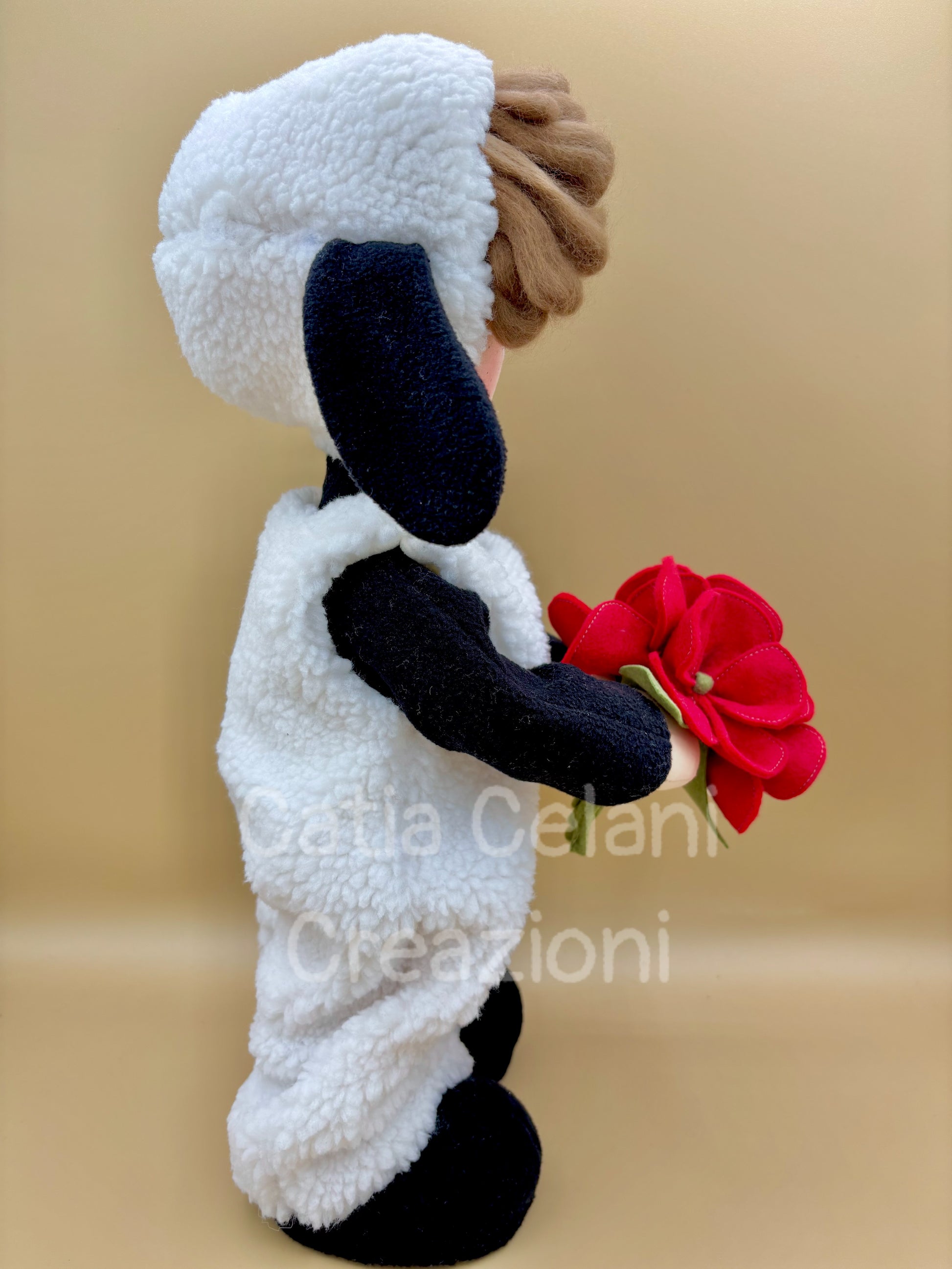 Guardalo lì, con quei riccioli castani che sbucano fuori dal suo cappuccino bianco come la neve, le guanciotte rosate e quegli occhietti neri che ti guardano con tutta la dolcezza del mondo. Ha deciso che oggi era il giorno giusto — e si è presentato con un mazzo di fiori rossi di feltro, grandi quasi quanto lui!