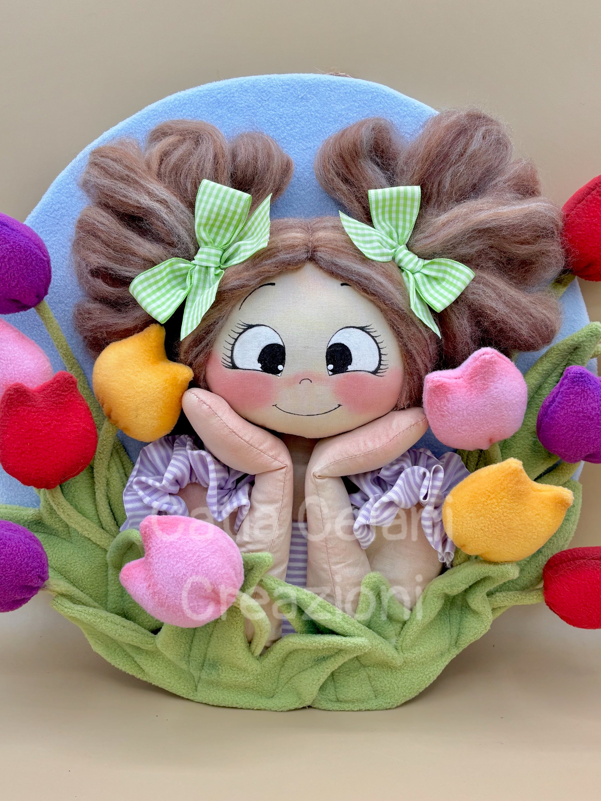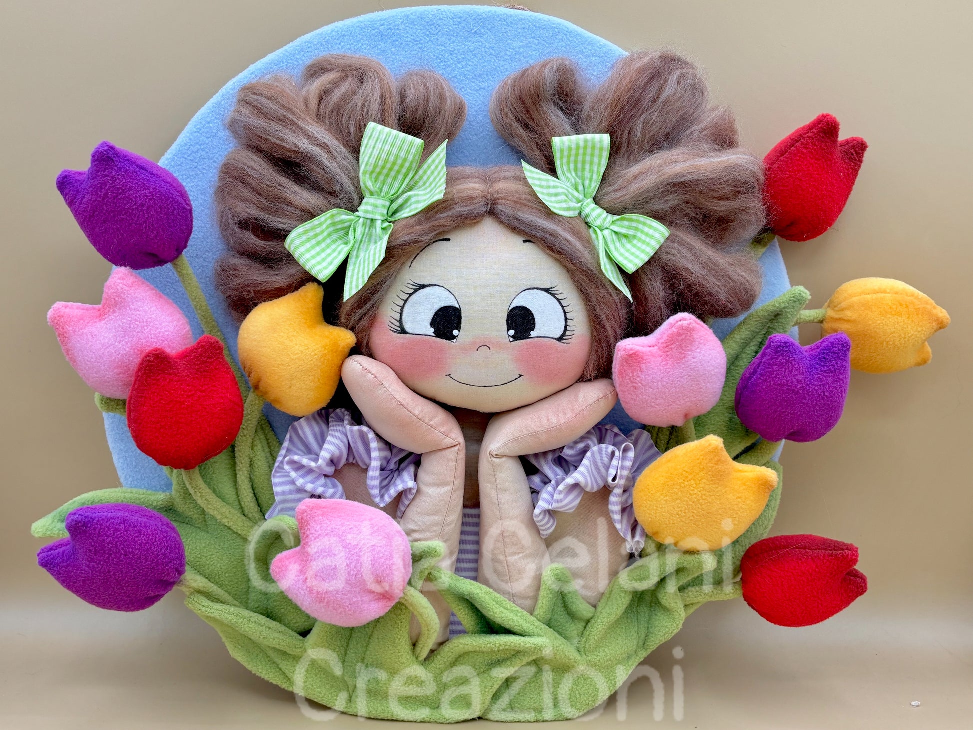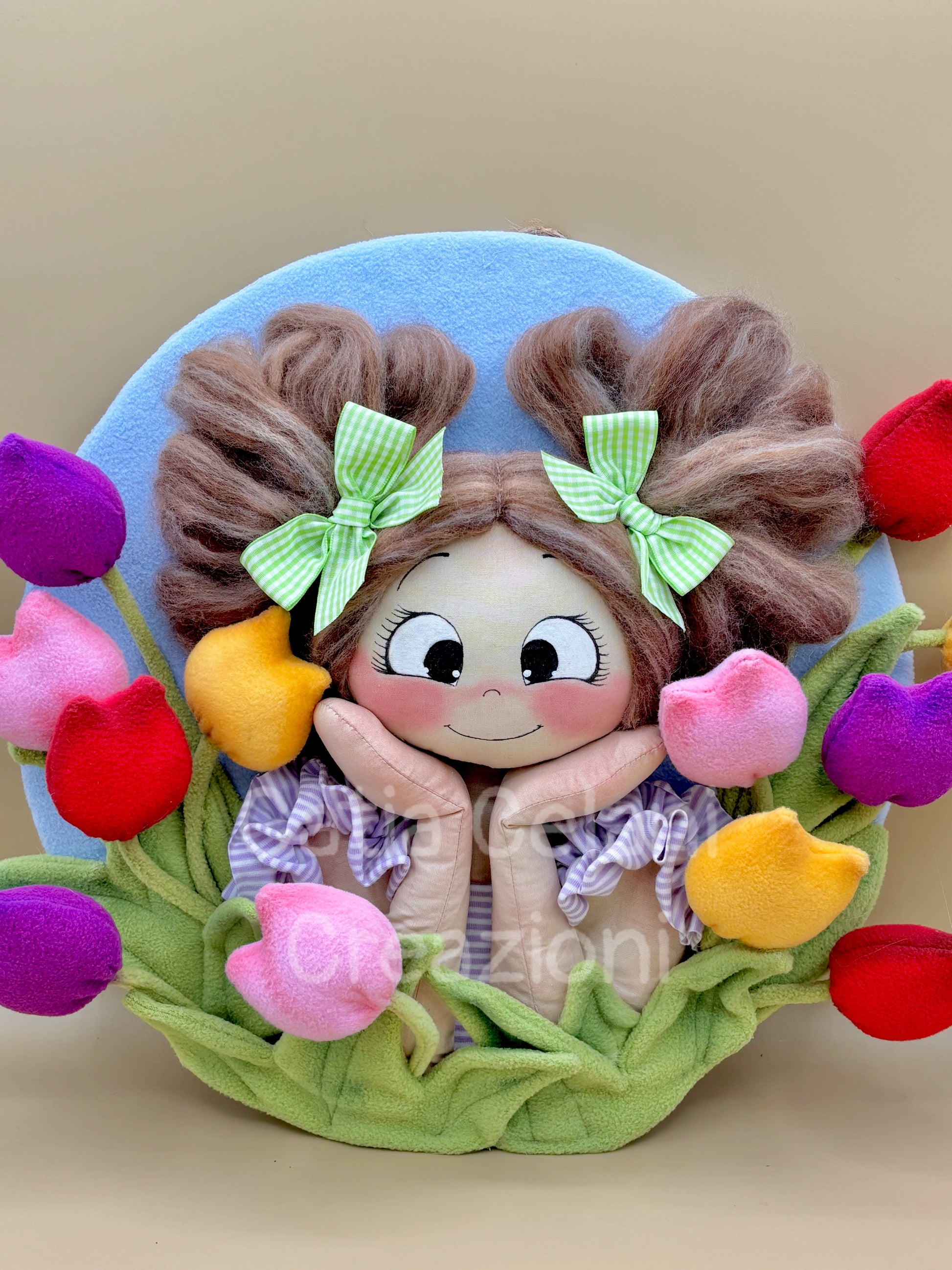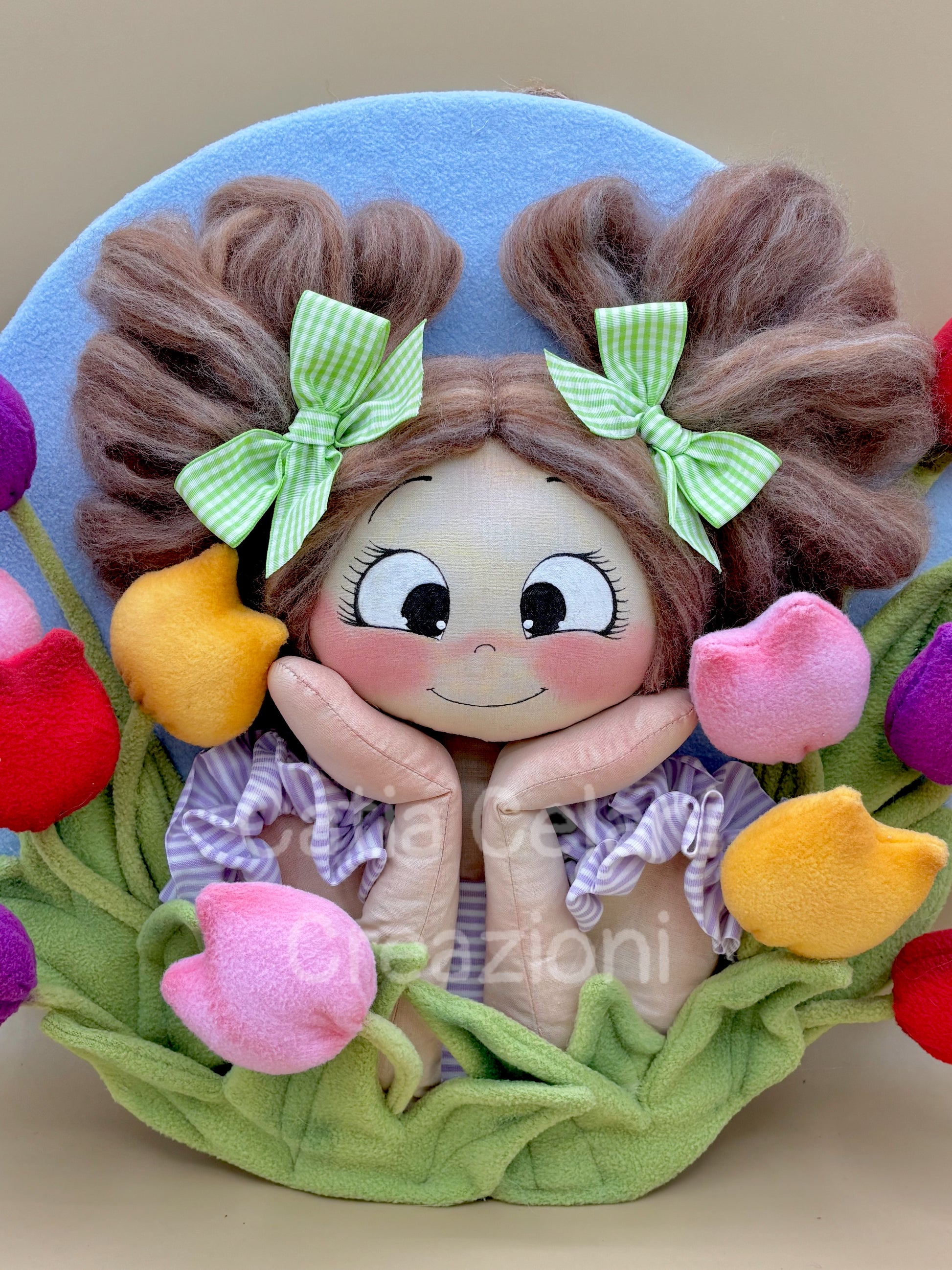 Il suo abbietto a righe lilla con il grembiulino a balze e il disco di fondo in pannolenci azzurro cielo completano un quadro che non è solo una decorazione — è un pezzo di primavera da appendere tutto l'anno.
