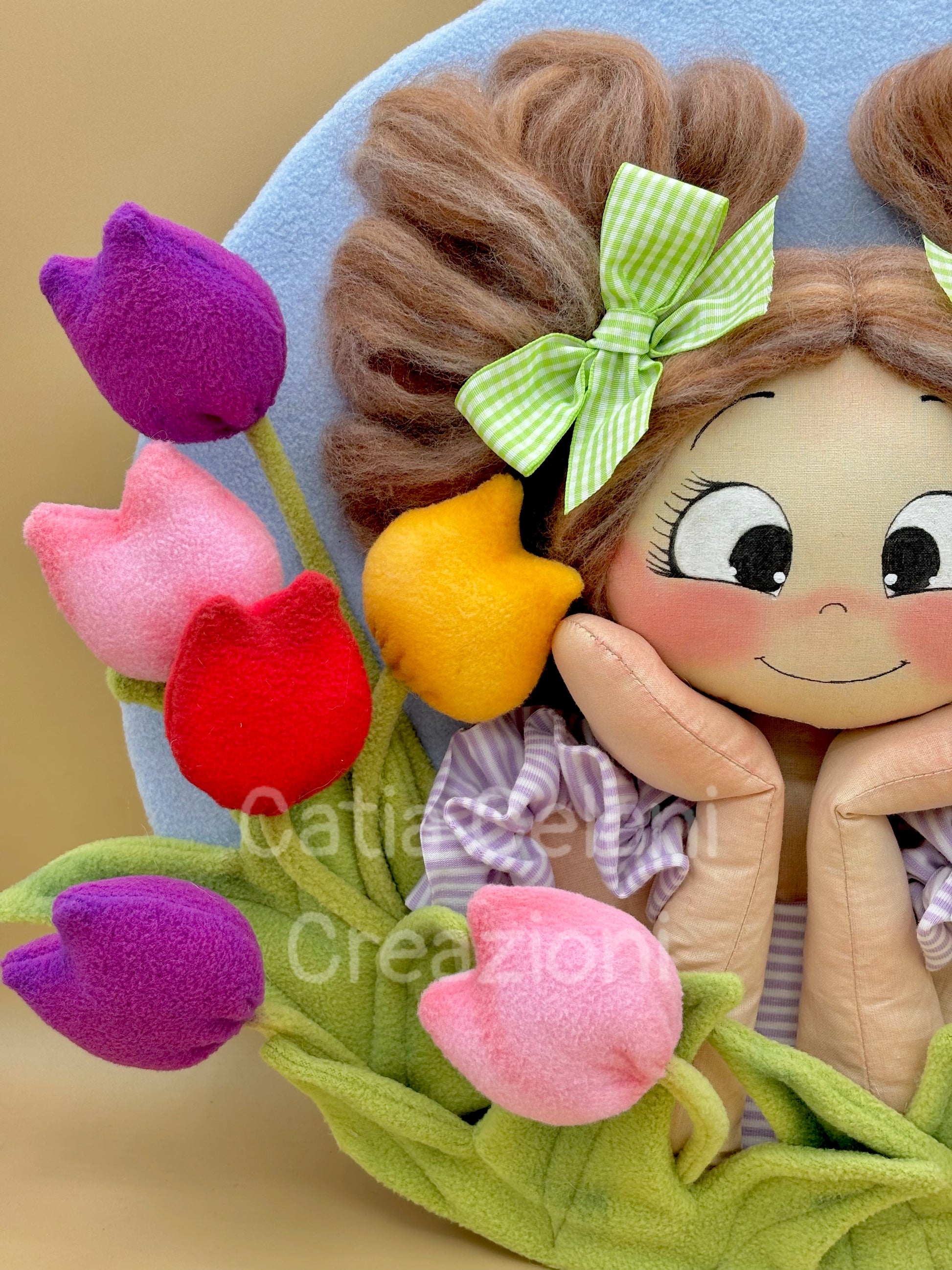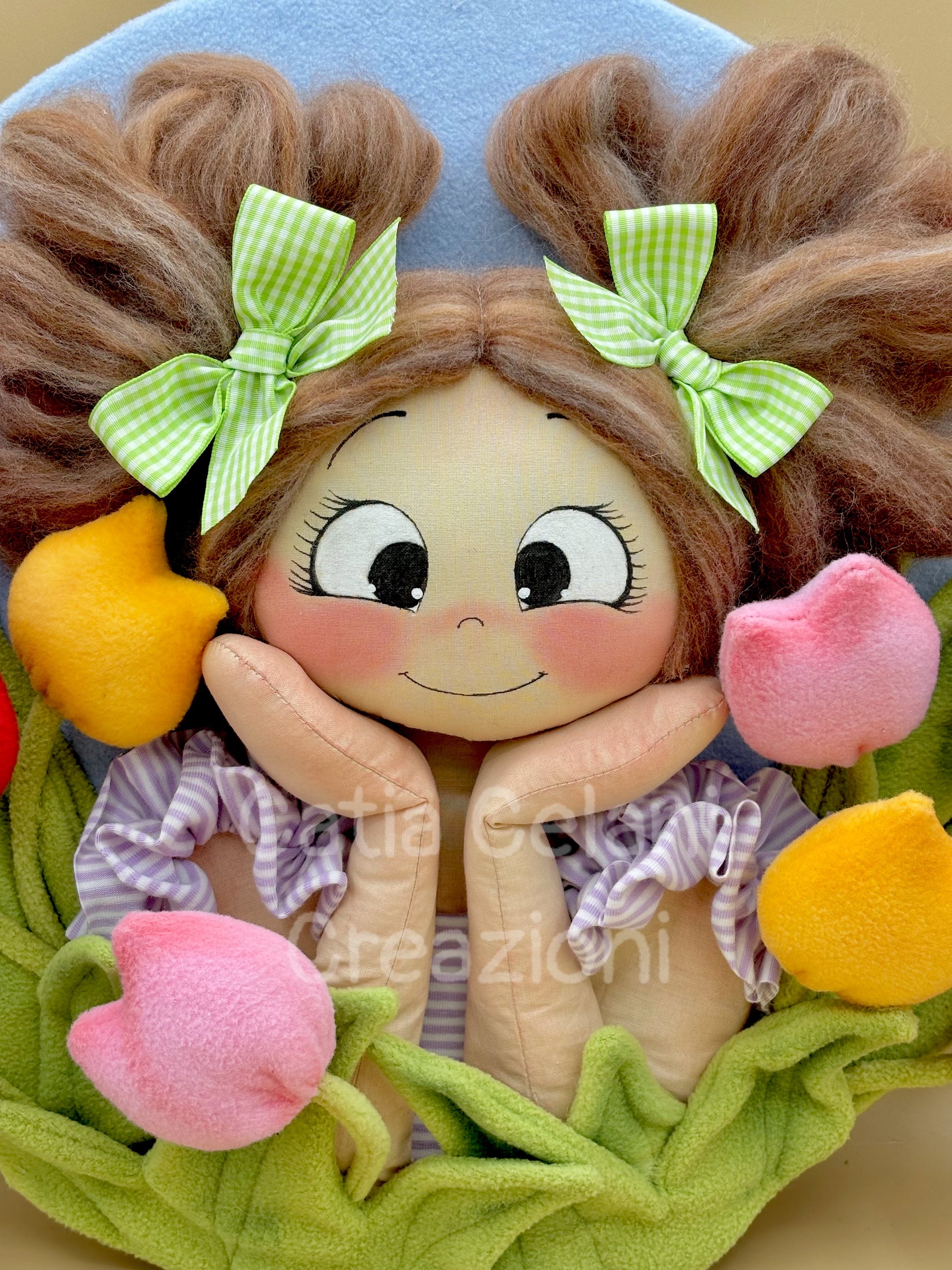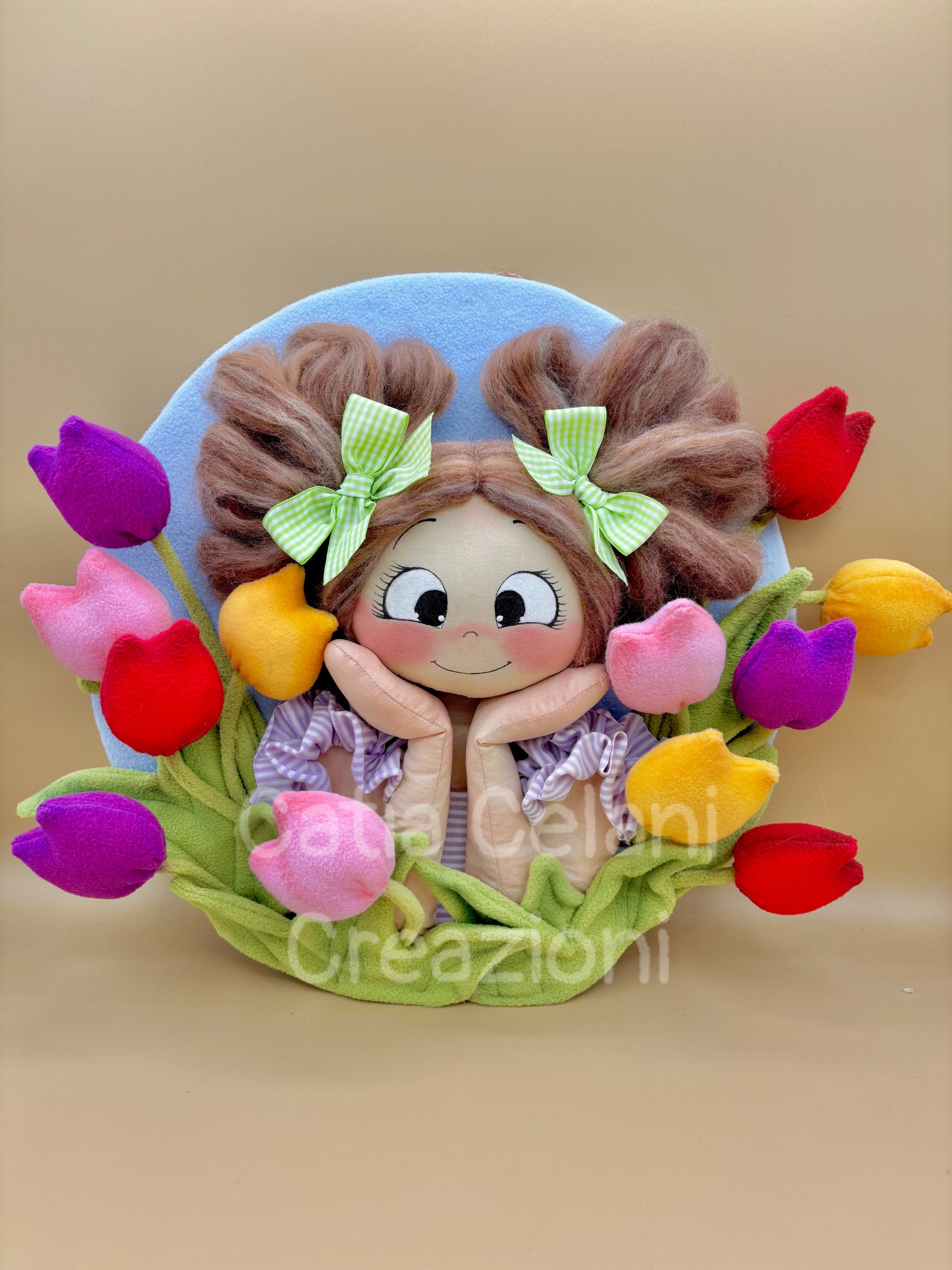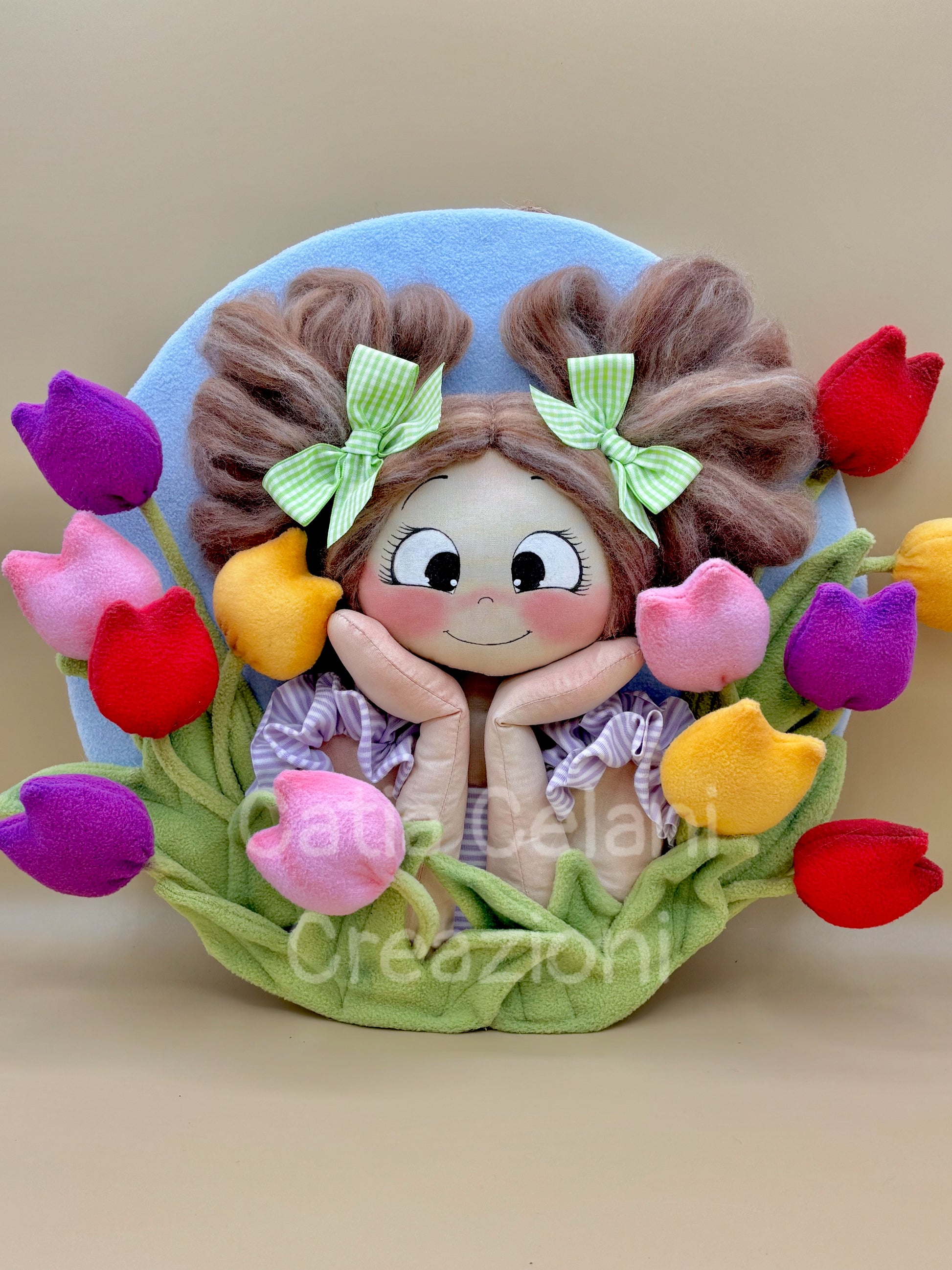 Il suo abbietto a righe lilla con il grembiulino a balze e il disco di fondo in pannolenci azzurro cielo completano un quadro che non è solo una decorazione — è un pezzo di primavera da appendere tutto l'anno.