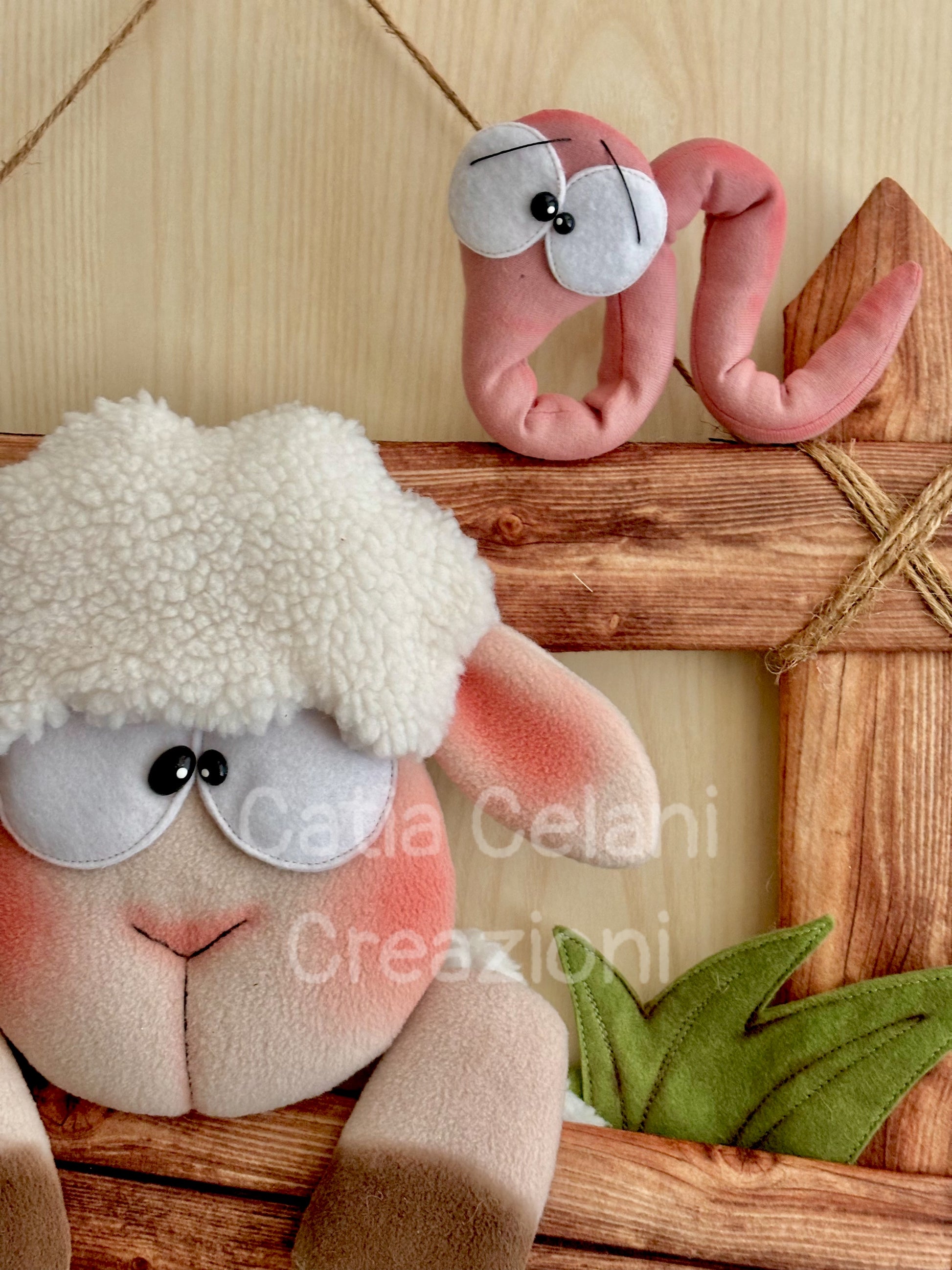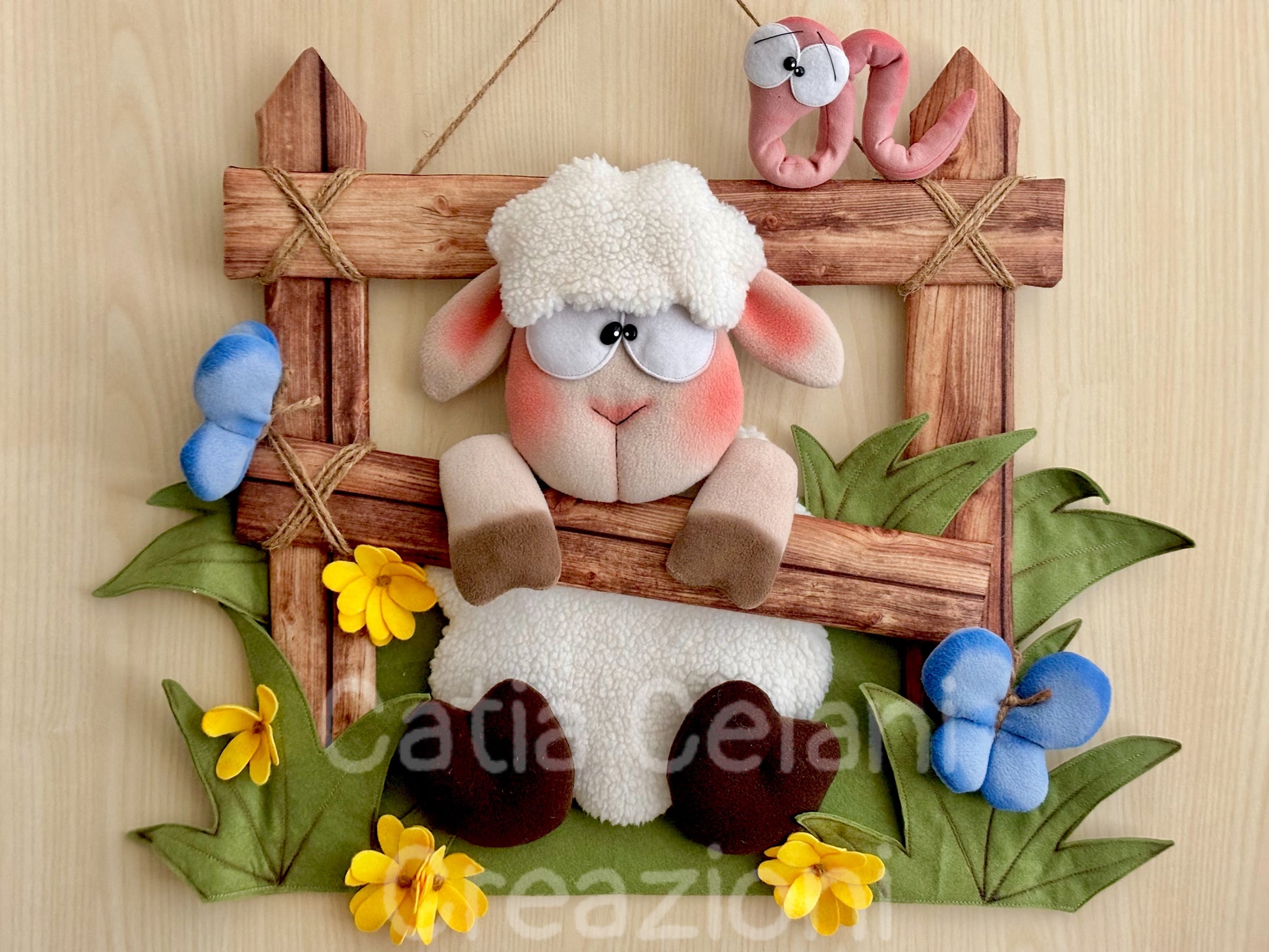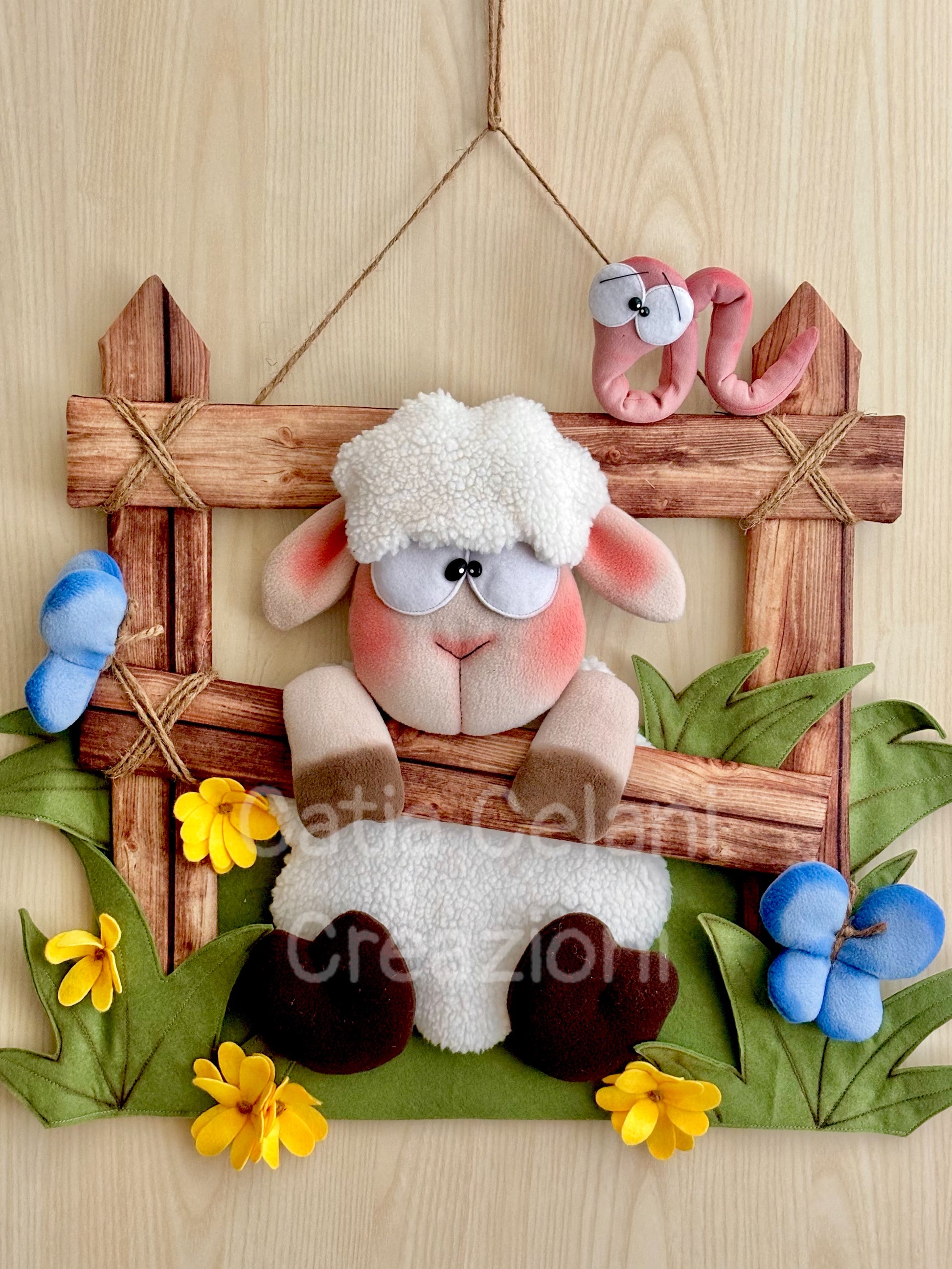 Ma non è sola! In alto, arrotolato sul paletto della staccionata con quegli occhioni sgranati e quell'aria un po' sorpresa di chi è stato scoperto, c'è un vermetto rosa che sembra chiedersi come sia finito lì. Ai lati, farfalle azzurre in pile morbido e fiorellini gialli di feltro completano il prato primaverile, tutto su una base verde con foglie cucite che profuma — almeno visivamente — di campagna e aria buona.