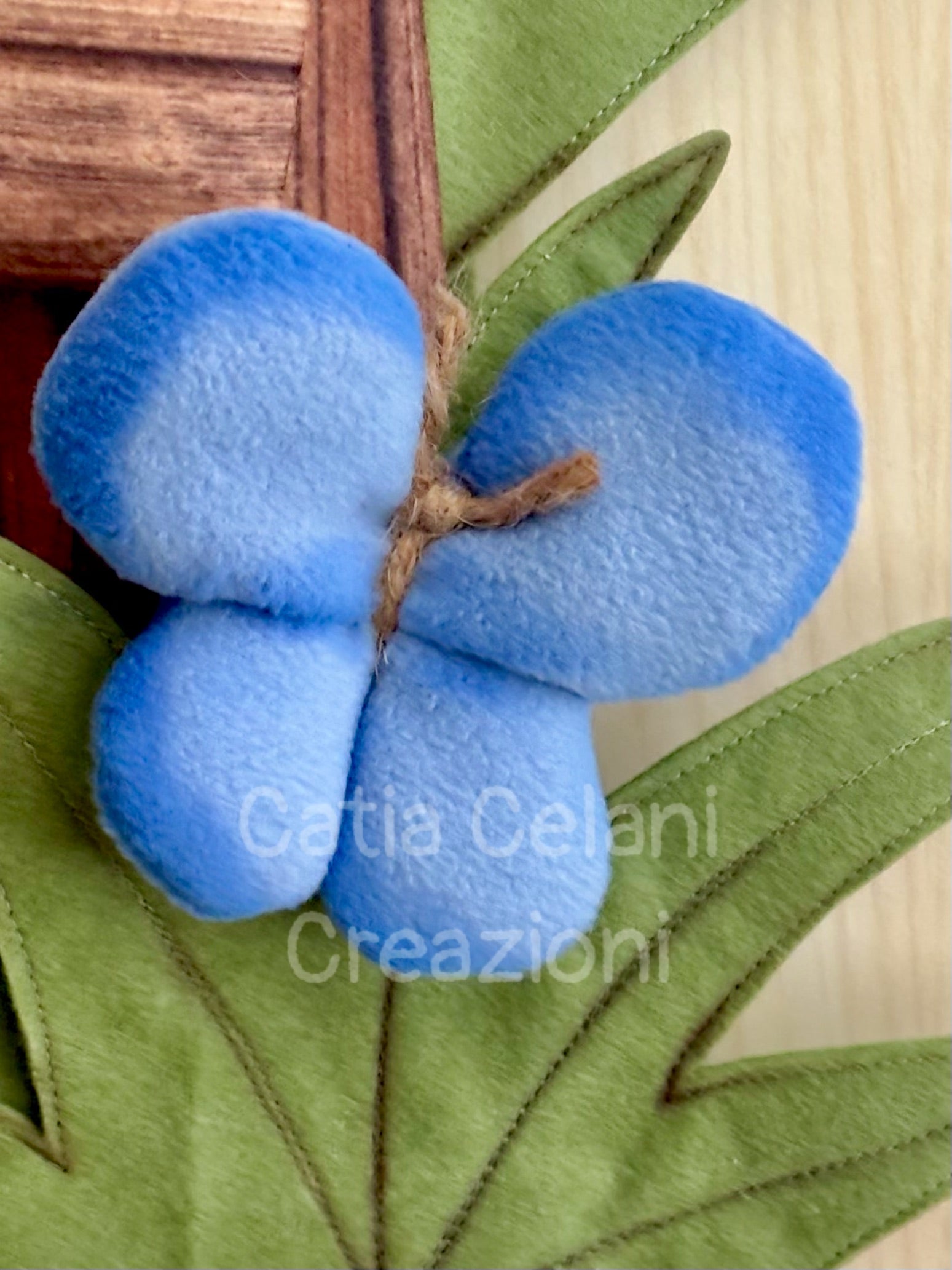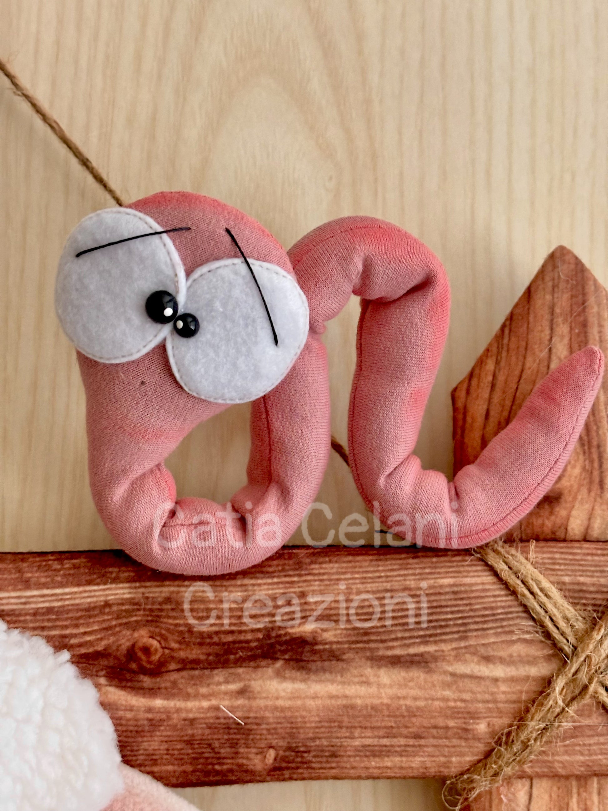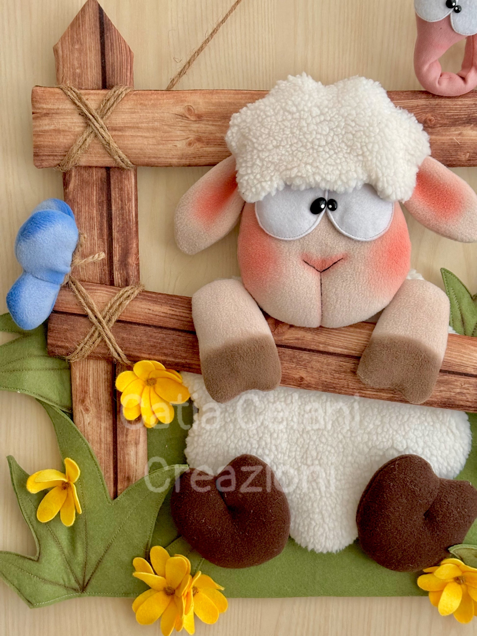 Ma non è sola! In alto, arrotolato sul paletto della staccionata con quegli occhioni sgranati e quell'aria un po' sorpresa di chi è stato scoperto, c'è un vermetto rosa che sembra chiedersi come sia finito lì. Ai lati, farfalle azzurre in pile morbido e fiorellini gialli di feltro completano il prato primaverile, tutto su una base verde con foglie cucite che profuma — almeno visivamente — di campagna e aria buona.