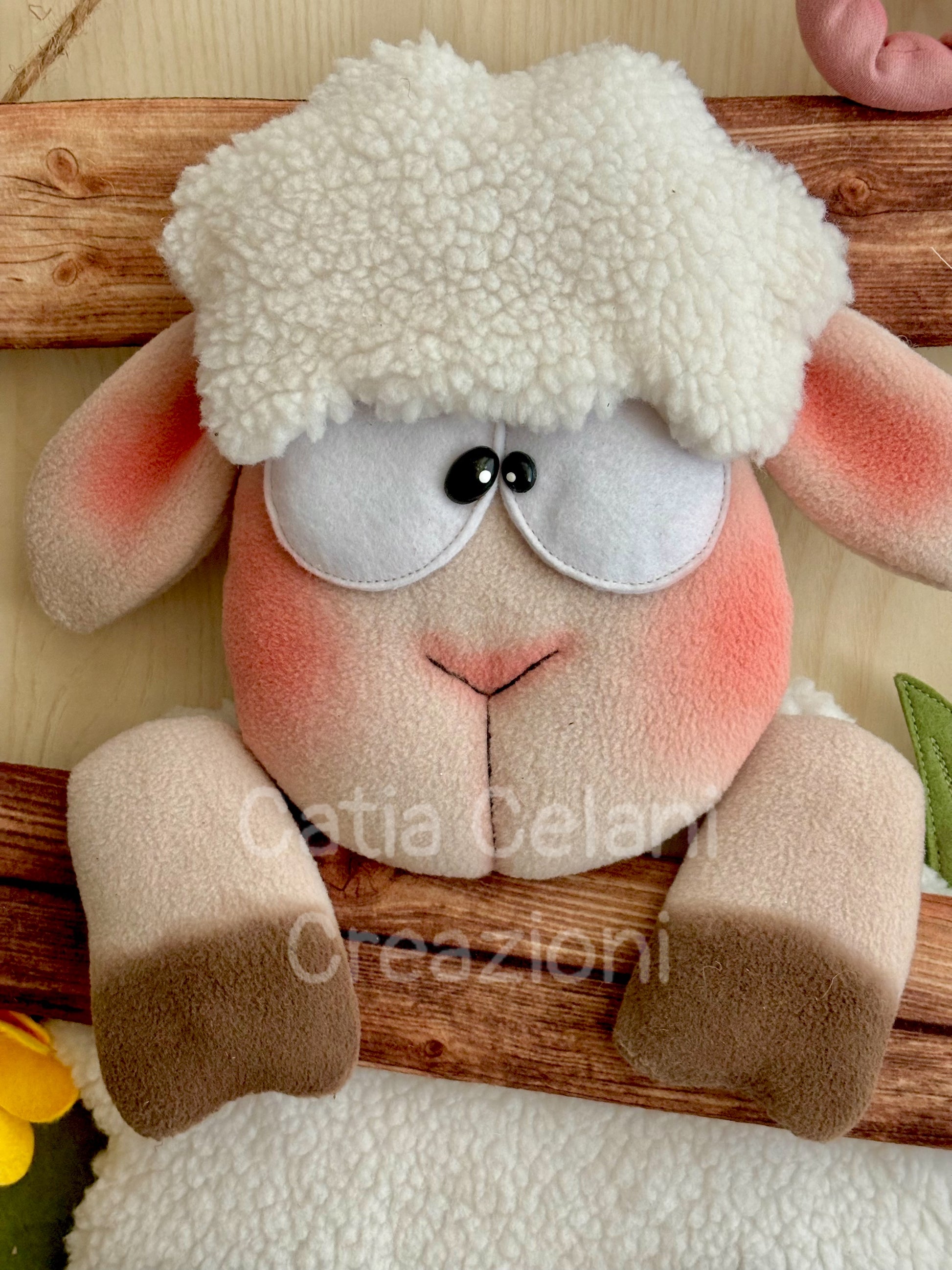 Una pecorella con le guanciotte rosate e quegli occhialetti bianchi di feltro che la fanno sembrare una bibliotecaria in pensione ha deciso che oggi lo steccato di legno rustico è il posto migliore del mondo — e ci si è appoggiata sopra con tutta la tranquillità del caso, le zampette ciondoloni e un'aria da "ho tutto il tempo del mondo".