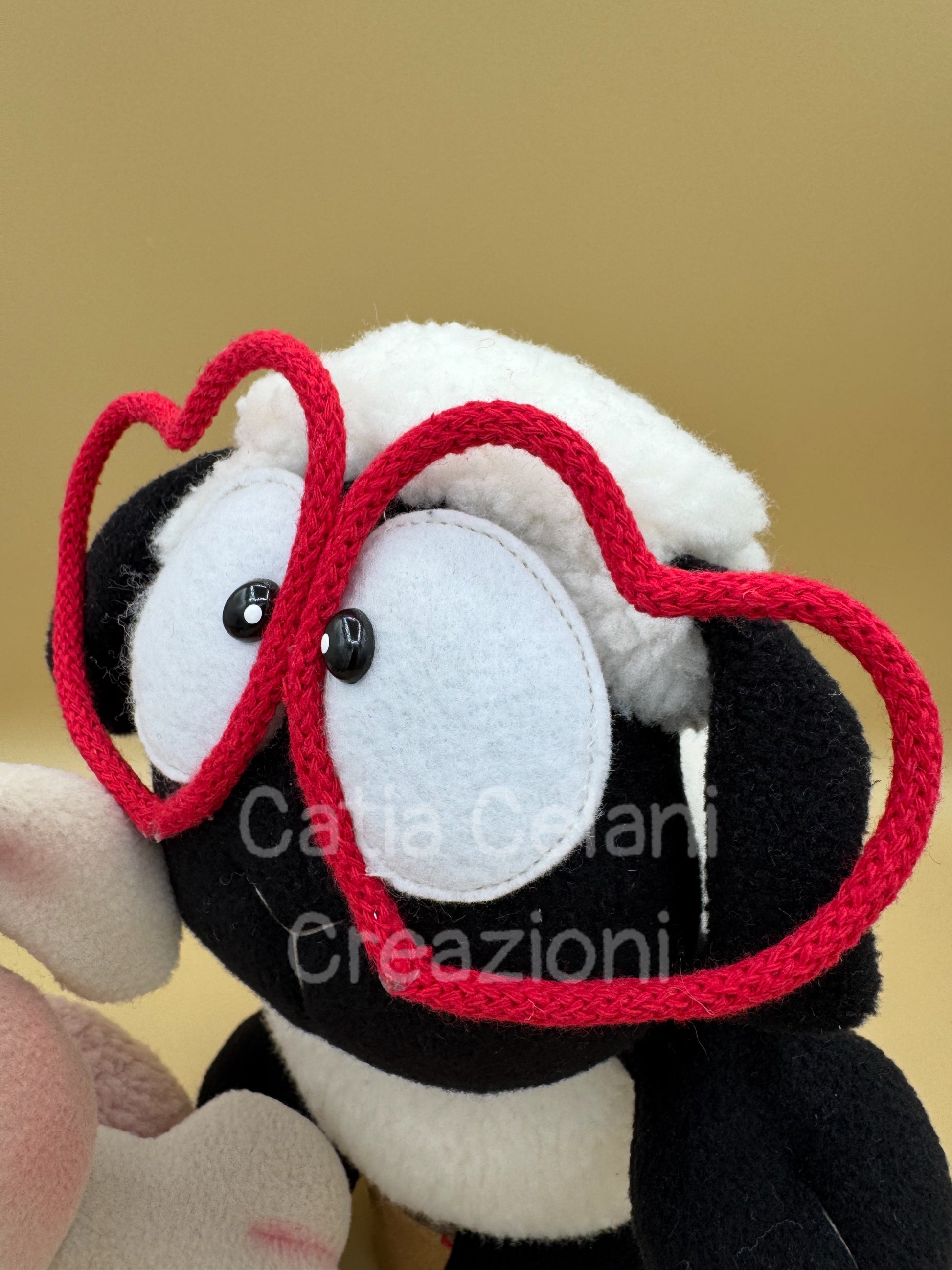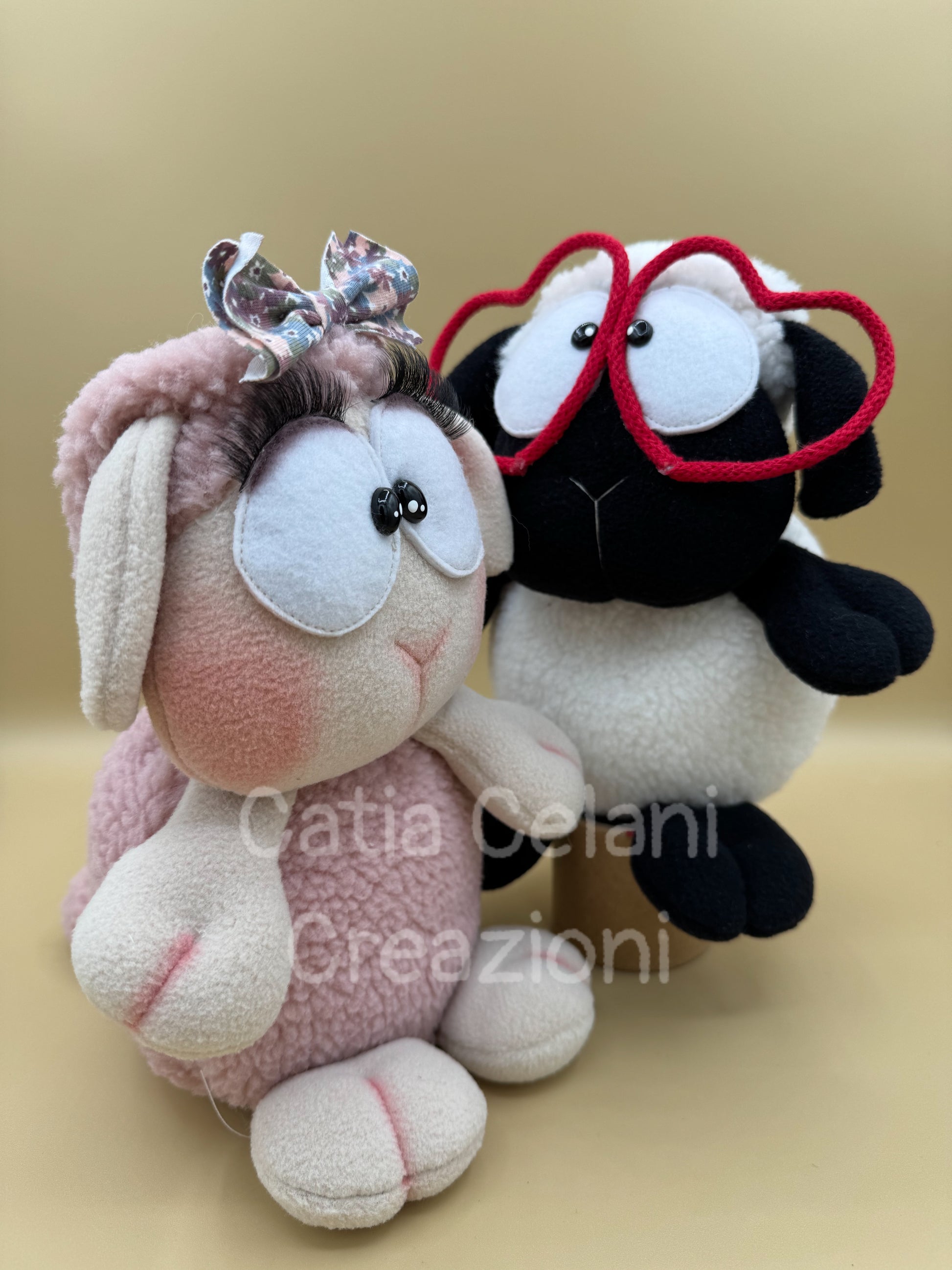 C'è lui, bianco e nero deciso, con quegli occhiali a cuore rossi che lo fanno sembrare un innamorato cronico e inguaribile — il tipo che manda fiori senza motivo e non se ne vergogna per niente. E poi c'è lei, tutta rosa cipria e tenerezza, con le orecchie flosce, le ciglia finte lunghissime e il fiocchetto liberty che le dà un'aria da signora romantica di altri tempi.